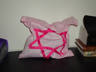 Gathering materials was easy. I had just enough of a pink-and-white check for the bag; it closes at the top with a pink circle button. (Tefillin bags usually zip closed; I don't know how to do zippers.) A tefillin bag is usually richly, ornately embroidered. I knew I could not do anything like what is usually seen, but I had to decorate my new bag somehow. By luck--or the grace of God, depending whom you ask--I had narrow, bright pink ribbon. I made a large Jewish star on the front of my bag, using strips of this ribbon.